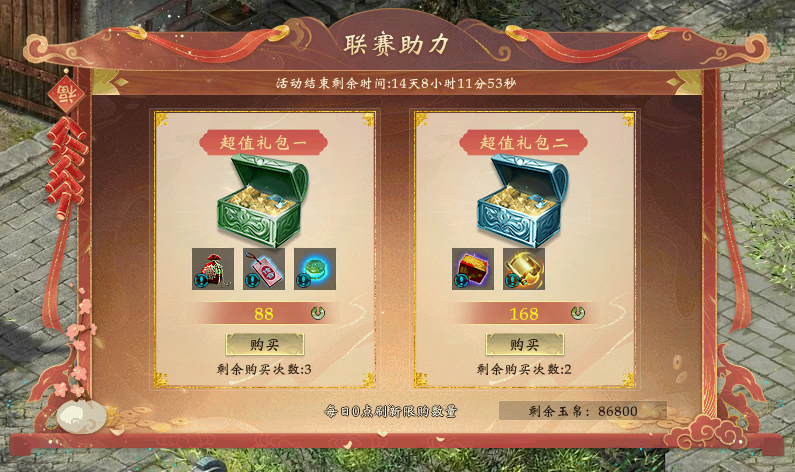 活动期间将限时发售2个联赛助力礼包,等级达到80级的角色每天可购买礼包。