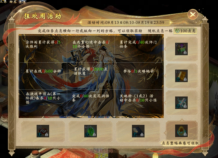(3)完成任务点亮画卷,点亮任意横向一行或纵向一列的方格,可领取奖励,完成所有任务可领取额外奖励。