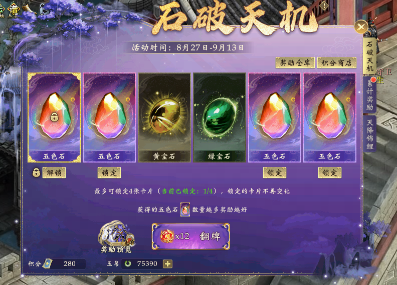 (4)祈福后可将获得的五色石锁定,继续祈福不会改变已锁定的五色石,最多可锁定4个五色石,锁定的五色石越多,祈福时消耗的天机石越多;