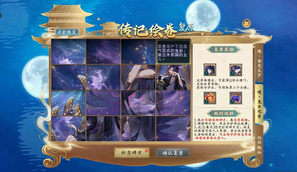(6)活动期间每日20:00前在石破天机消耗玉帛可获得天降锦鲤奖券,每晚20:10开启天降锦鲤,每轮随机抽取1张奖券,中奖玩家可获得全新守护境·金光太岁、境·鬼目观音,当日全服在石破天机活动中消耗的玉帛越多,抽取的守护数量越多,每晚最多抽取8只守护。