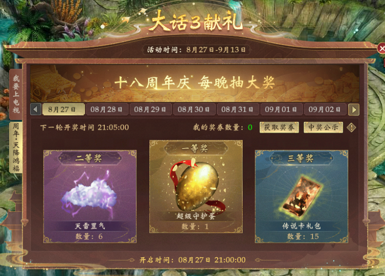 活动时间:8月27日-9月16日每天19:00-22:00开启