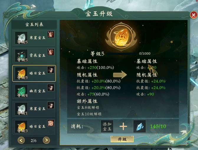 ②消耗普通宝玉可以提升250点升级进度,消耗带有特效词条的宝玉可以提升1000点升级进度;