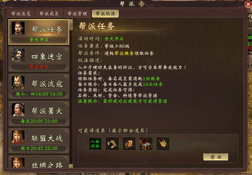 【4】任务奖励:完成任务可得:石料、木材、资金、科技等帮派资源。